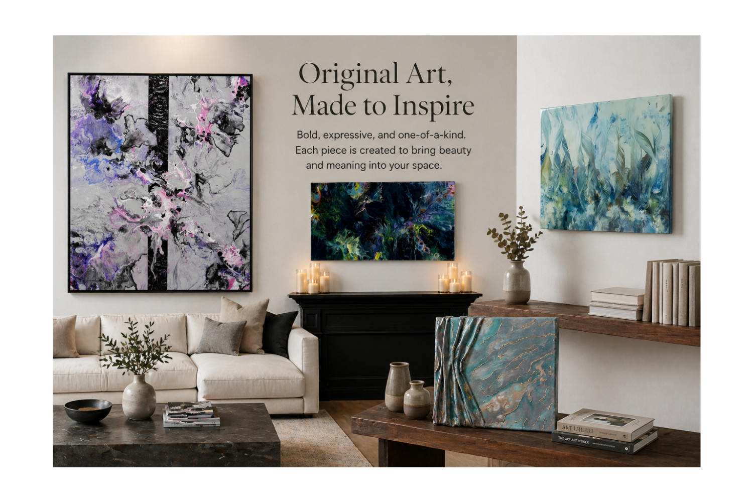 Custom original handmade abstract acrylic pour painting featuring rich blues, teal, and soft violet tones flowing over a deep black with purple tint background. A one-of-a-kind fluid artwork that adds depth, movement, and modern elegance to any space